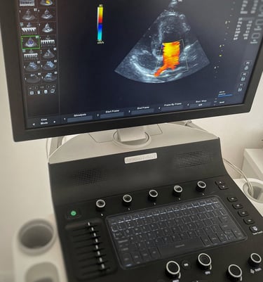 BADANIE ECHOKARDIOGRAFICZNE: badanie serca przy użyciu wysokiej klasy sprzętu ultrasonograficznego, który umożliwia wykrycie wad wrodzonych, chorób zwyrodnieniowych zastawek, powiększenia serca.